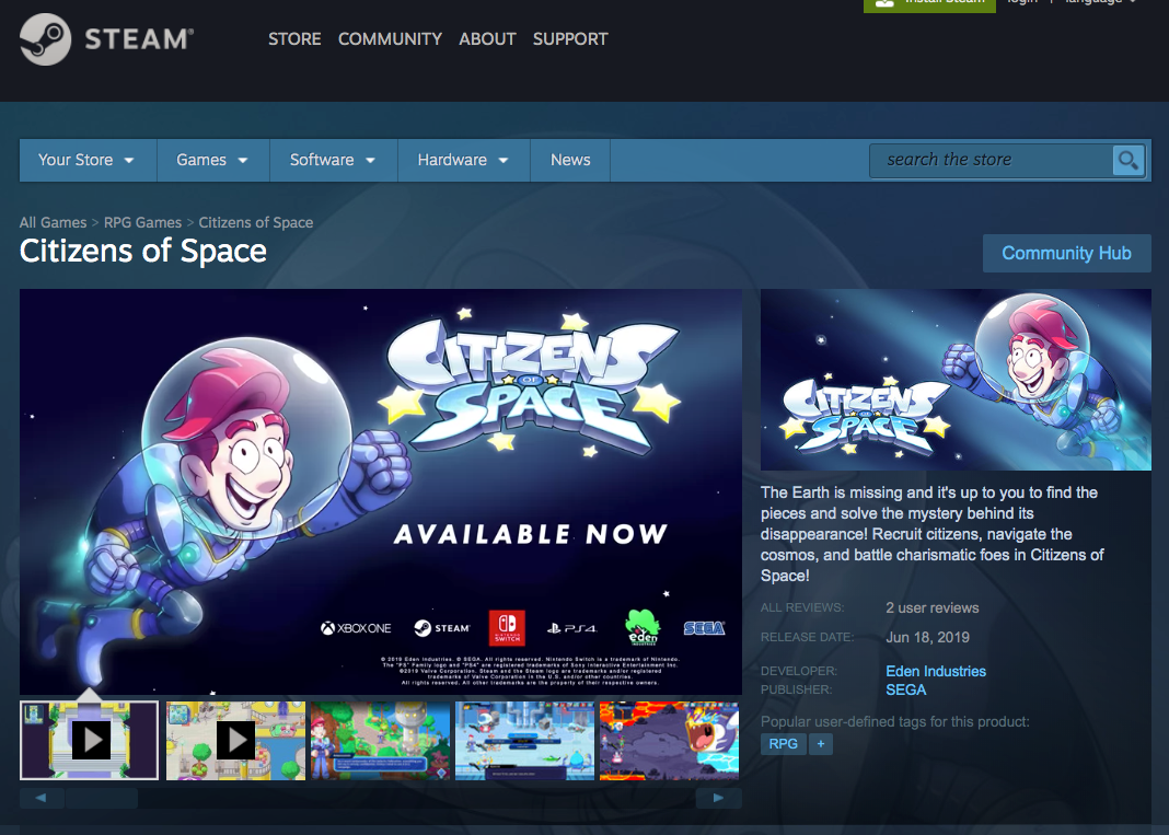 Description: A fantastical RPG adventure set in a vibrant cartoon future. The Earth is missing and it's up to you to find the pieces and solve the mystery behind its disappearance! Recruit citizens, navigate the cosmos, and battle charismatic foes in Citizens of Space!